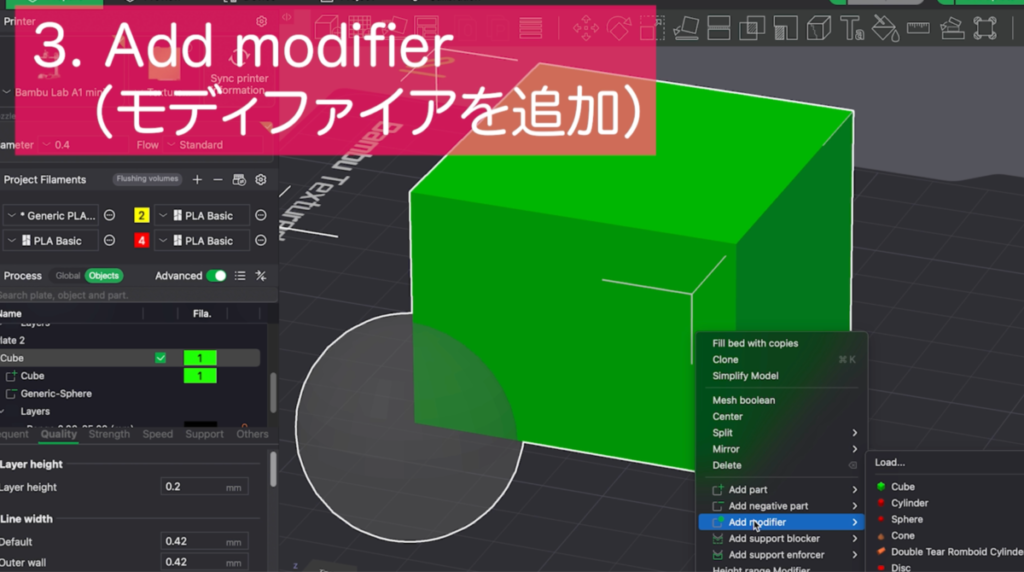 3Dプリントの設定は、モデル全体だけでなく部分的に変更することが可能です。