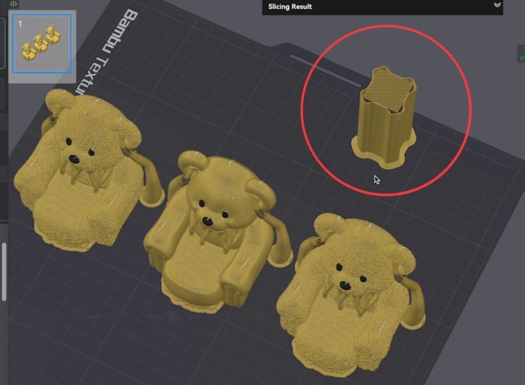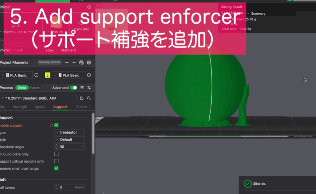スライス結果を見ると、側面に張り付くようにサポートが設定されるため、少し不思議な感覚になるかもしれません。