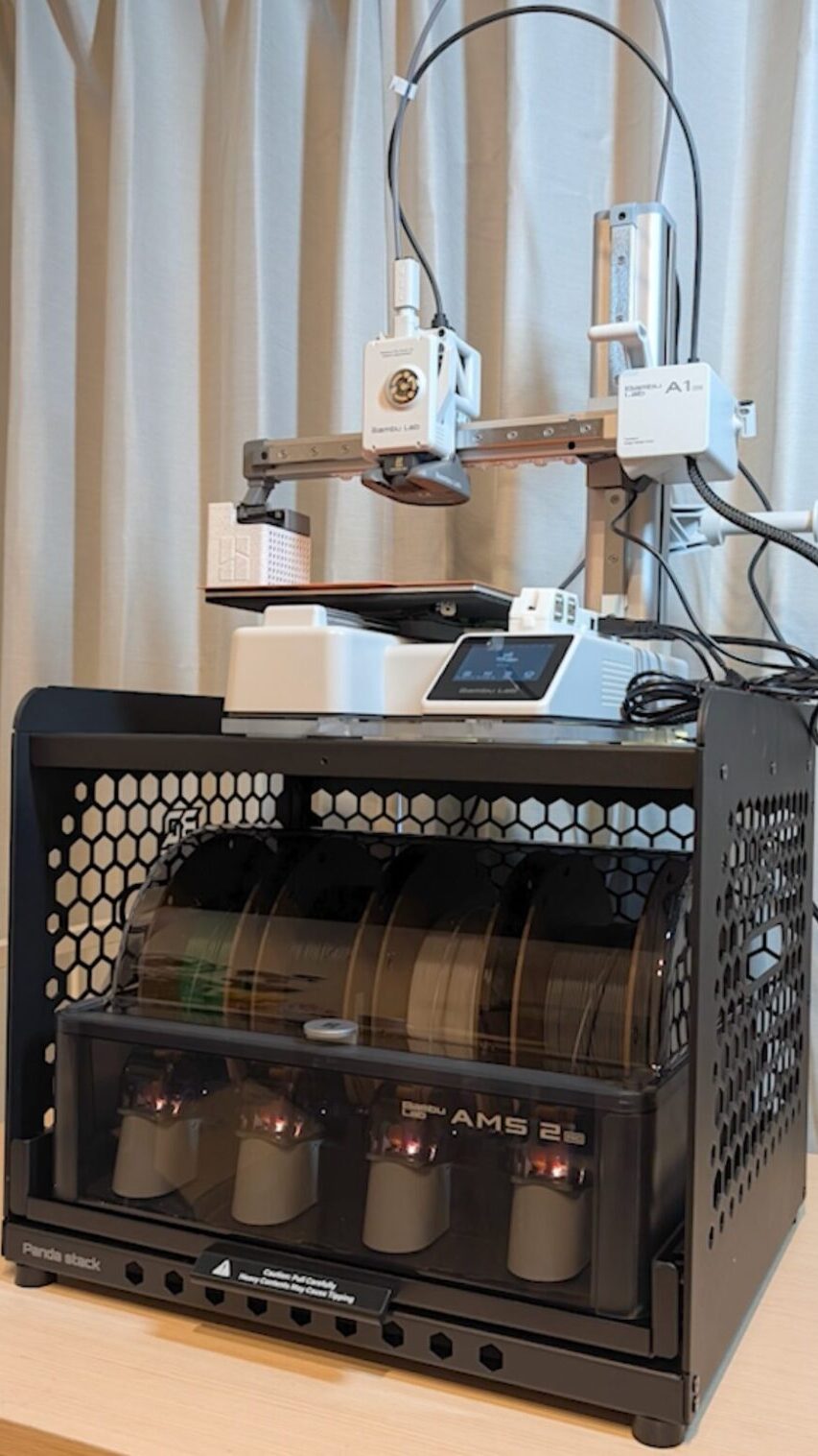 「Panda Stack」を使って上に積み上げる配置にすれば、ほとんど設置面積を増やさずに「A1」でも「A1 mini」でもAMSを活用できるため、かなり重宝するでしょう。