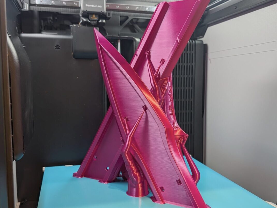 実際に0.6mmの太めノズルを使って、スパイラルモードでのフルサイズプリントを行ったところ、身体を隠すほど大きなモデルが完成しました。