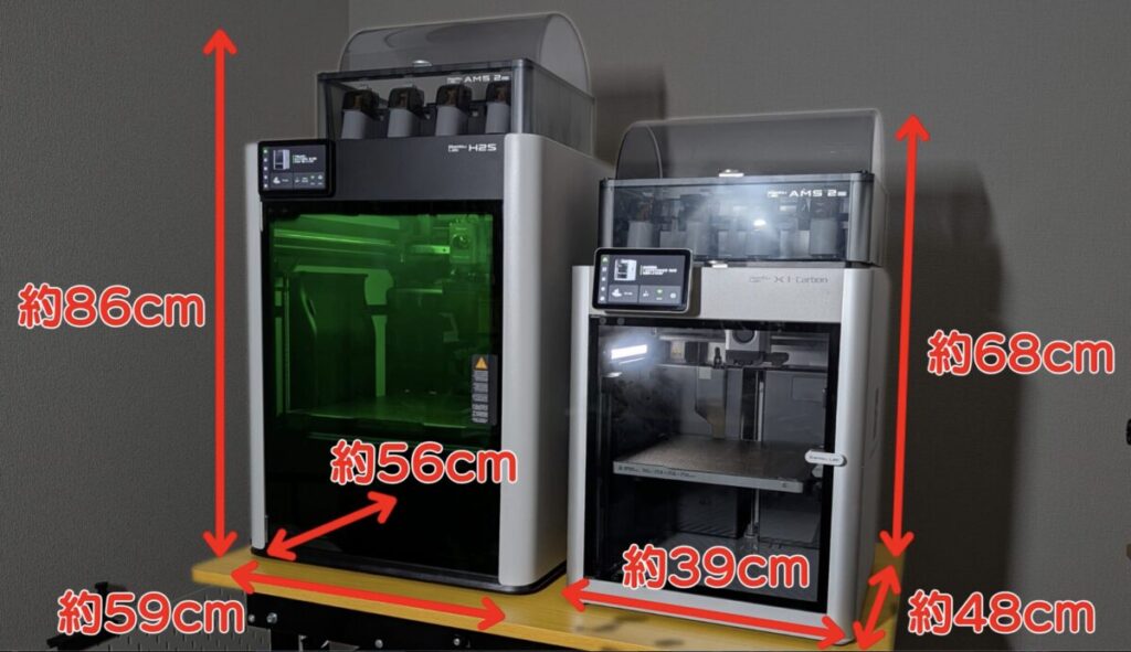 以下の画像のように、「P1S」と同じくらいのサイズである「X1-Carbon」と比較すると、「H2S」は幅と高さがおよそ20cm、奥行きが10cmほど大きくなっています。