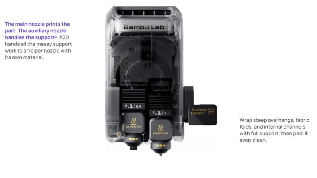 このデュアルノズル構造は、たとえば複雑なサポート構造を必要とするモデルのプリント時に活躍します。