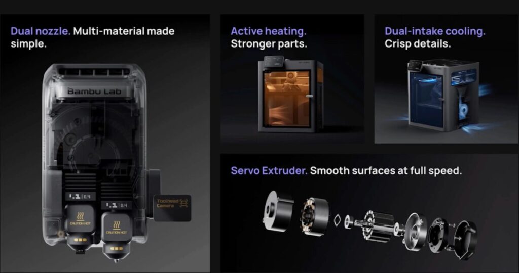 1台のAMSから両方のノズルにフィラメントを供給することもでき、作業効率が大きく向上します。