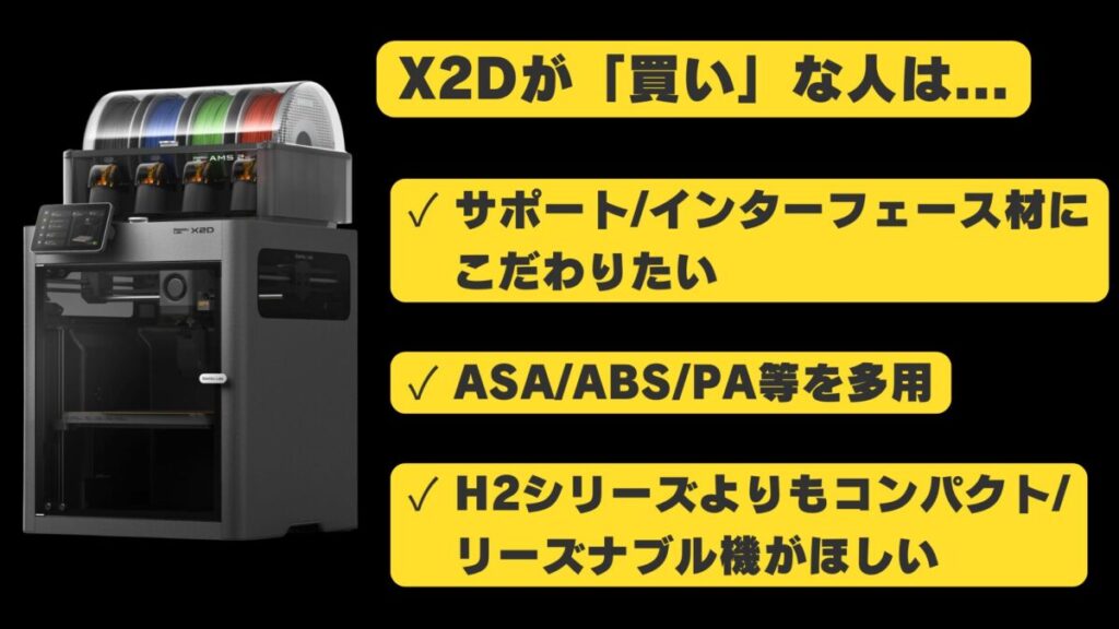 加えて、使用するフィラメントがPLAやPETG中心という方にとっては「X2D」は少しオーバースペックになる可能性があります。