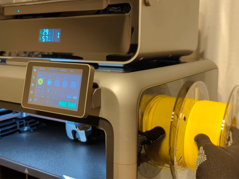 プリンター本体にはフィラメントのRFID読み取り機能が搭載されていて、タッチするだけで自動でフィラメントの種類や色を認識してくれるのは意外と便利です。
