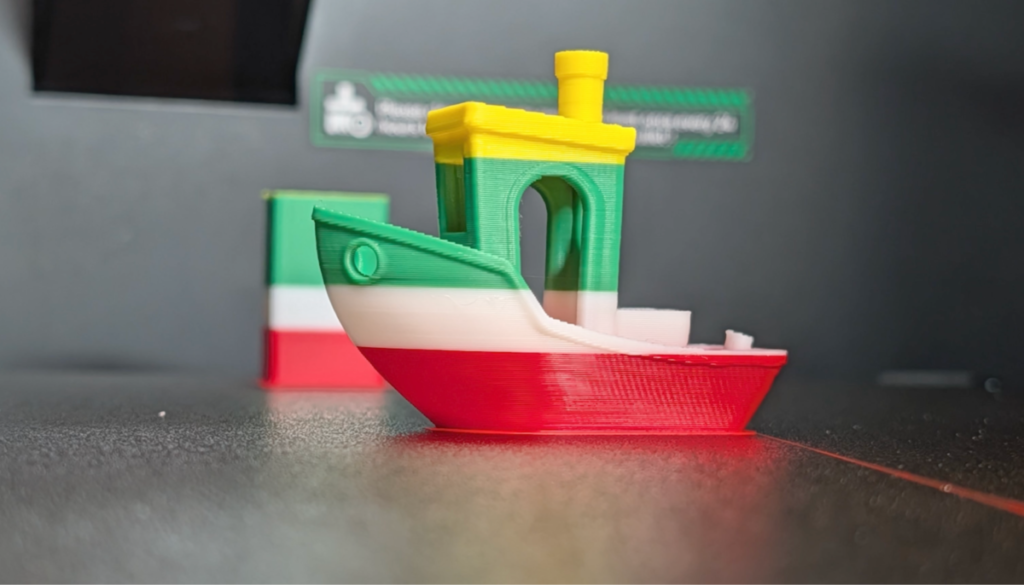 本体に保存されていた3DBenchyを赤・白・緑・黄色の4色でプリント。