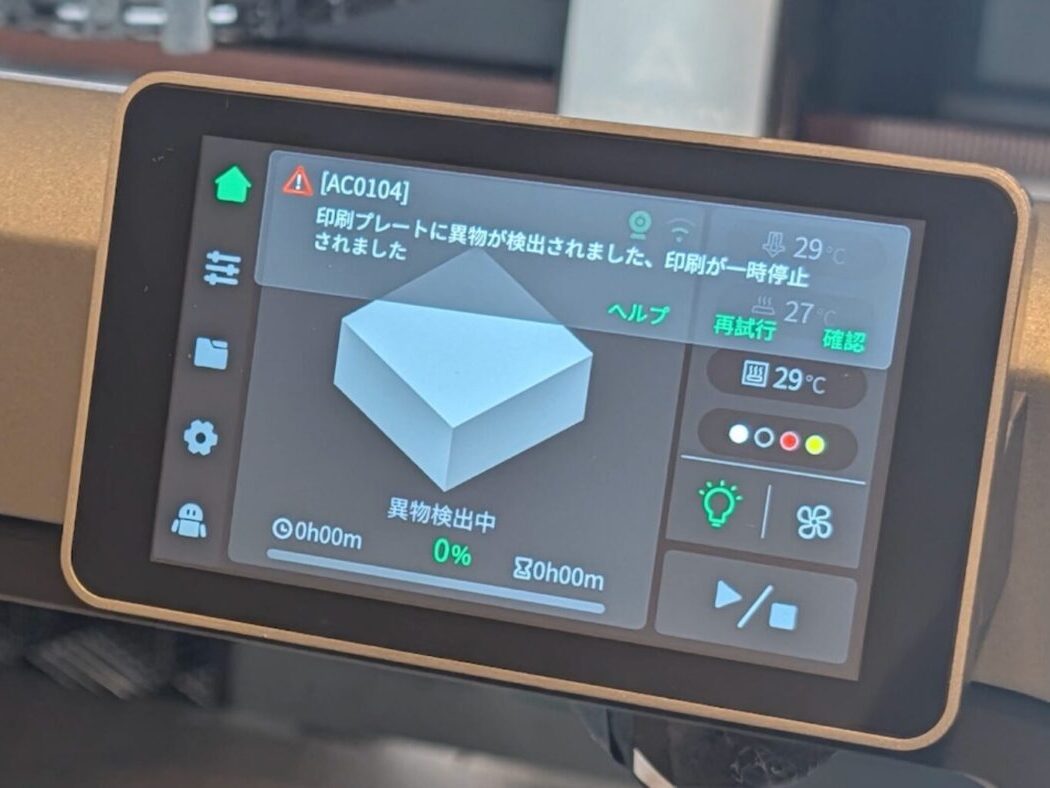 プリント前にうっかりベッドの上に物を置きっぱなしにしてしまったケースで地味に役立つもので、自動で検出してプリントを一時停止・アラートを表示してくれます。
