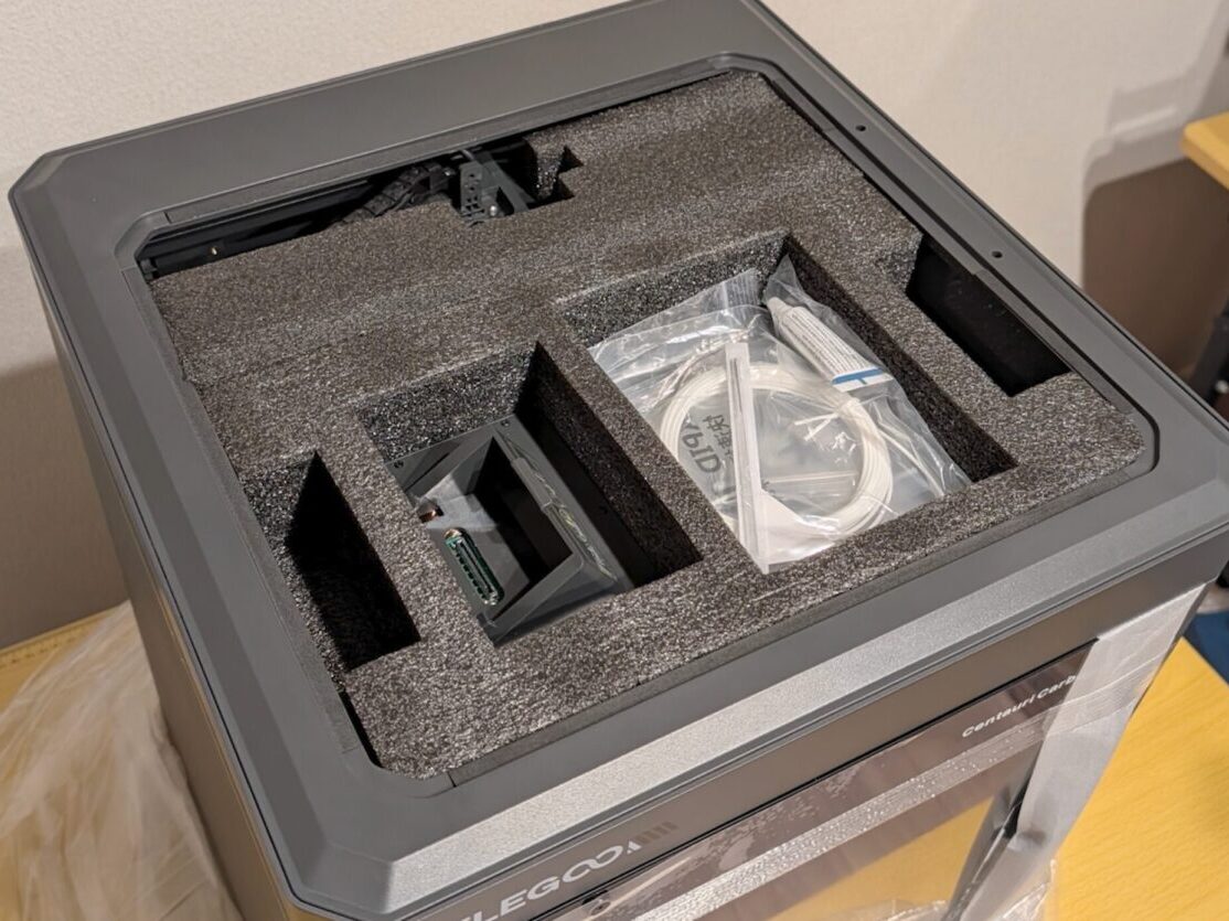 箱を開封し、説明書やクイックスタートガイドを取り出すと、その下から「Centauri Carbon 2」の本体が登場。