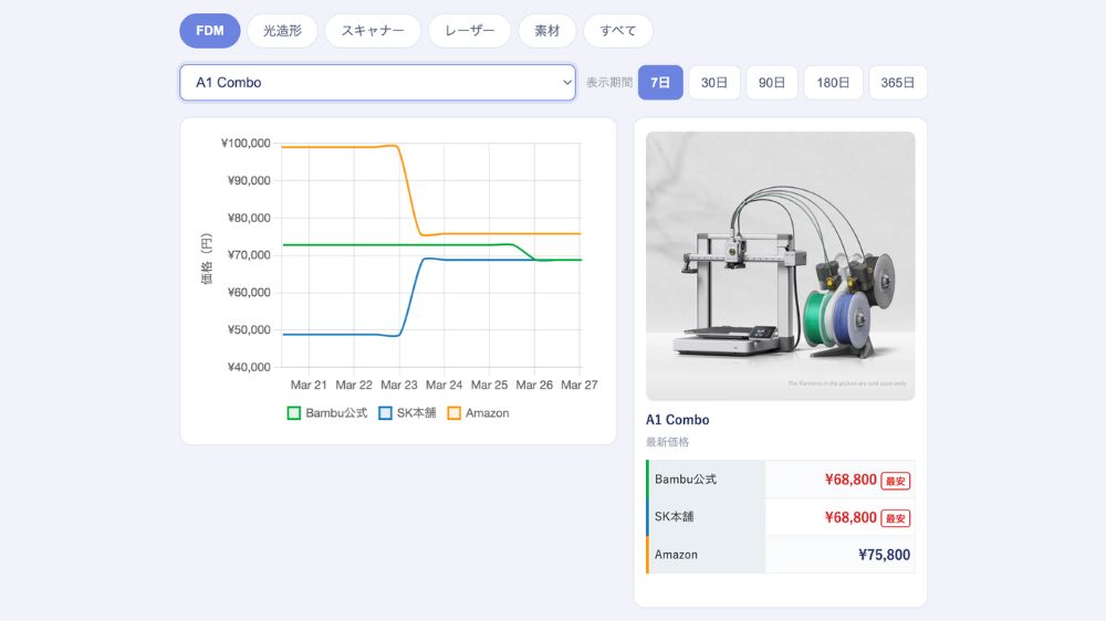 複数ショップ横断!価格比較&推移チェッカー X Facebook コピー 2025.01.12 〜景品表示法に基づく表記:本サイトのコンテンツにはプロモーションが含まれている場合があります〜 FDM 光造形 スキャナー レーザー彫刻機 フィラメント すべて 読み込み中... 表示期間 7日 🔒 30日 🔒 90日 🔒 180日 🔒 365日 🔒 全期間 機種を選択するとグラフが表示されます 機種を選択してください ※ 30日以上の価格履歴表示はメンバー限定です。※ 価格は自動取得のため実際と異なる場合があります。各社サイトの構造変更により取得できないケースもあります。 × メンバー限定コンテンツ ラボメンバーPlusのパスワードを入力してください 入力 メンバーシップについて▼ ラボメンバーPlus プランに加入すると、以下の特典が利用できます。 🚫各種ツールの広告を非表示 📈価格トラッカーの30日以上の履歴を閲覧可能 🤖メンバー限定の3Dプリンター特化AIツールなどが利用可能 🎬限定動画の視聴など、下位プランの特典もすべて含まれます 🔑 ご利用方法:加入後、メンバー向けコミュニティ投稿に記載のパスワードを上の入力欄に入力してください。※パスワードは定期的に変更されます。最新のパスワードは都度コミュニティ投稿をご確認ください。 ▶ YouTubeでメンバーシップに参加する × 開発者へのメッセージ 🔒 他のユーザーには見えない非公開メッセージです 送信する