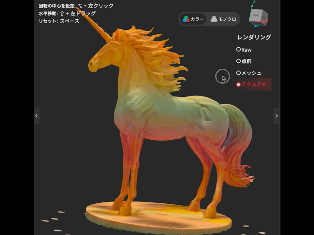 ユニコーンのフィギュアをスキャンした際は、鮮やかなテクスチャも含めて形状を取得できました。