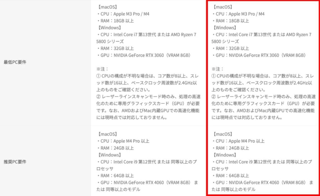 また、AMDおよびMac内蔵GPUではレーザーラインスキャン時の高速化機能に現時点で対応していない点には注意が必要です。