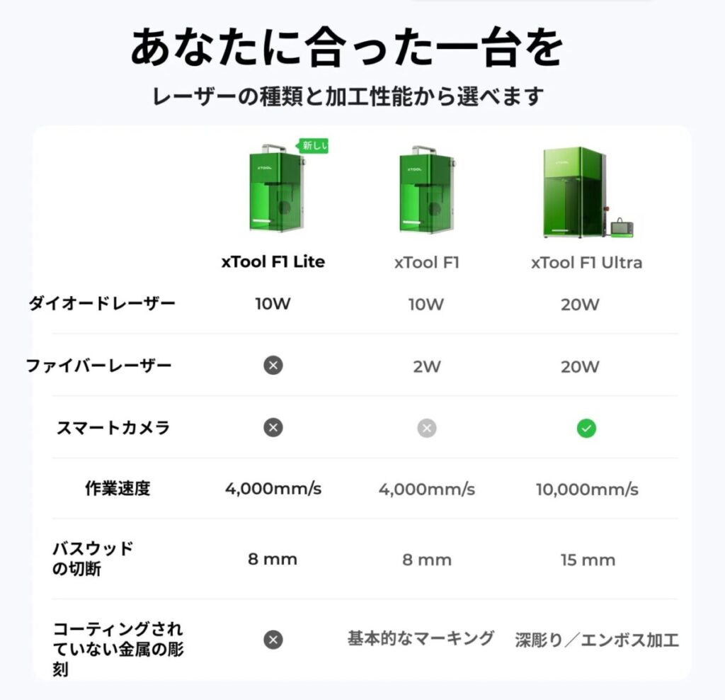 以上、xToolの家庭用レーザー彫刻機シリーズ各種の特徴を比較しました。